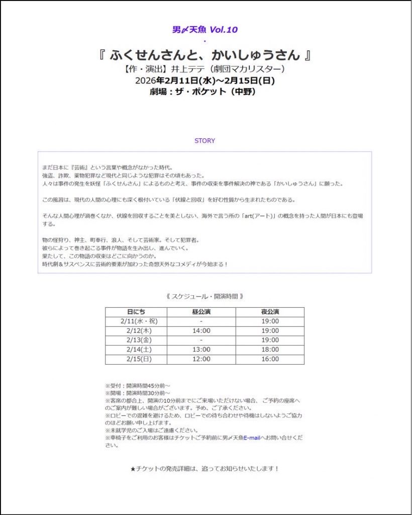 ニュース NEWS 2025.11.16 舞台 影山達也男〆天魚『ふくせんさんと、かいしゅうさん』出演決定! 男〆天魚公演 vol.10『ふくせんさんと、かいしゅうさん』 出演させて頂きます! 2026年2月11日(水)〜2月15日(日)ザ・ポケット http://ototen.info INDEX 藤田 玲村上 幸平鎌苅 健太髙木 俊佐々木 崇曽世 海司石田 隼畠山 遼影山 達也牛嶋 裕太大澤 信児山田 隼人藤村 リュウト三原 大和辻 悠正田久保 宗稔立道 梨緒奈髙橋 果鈴西葉 瑞希山﨑 紫生中根 百合香宮原 理子友部 柚里森下 結音遊佐 菜摘白河 ななみ蒼生 みなみ松林楓なしお 成佐々木 麻美DUSTZ水樹 たまいしいのりえ片山 佳音三浦 茜音星野 沙羽井坂 はるね田中 晴