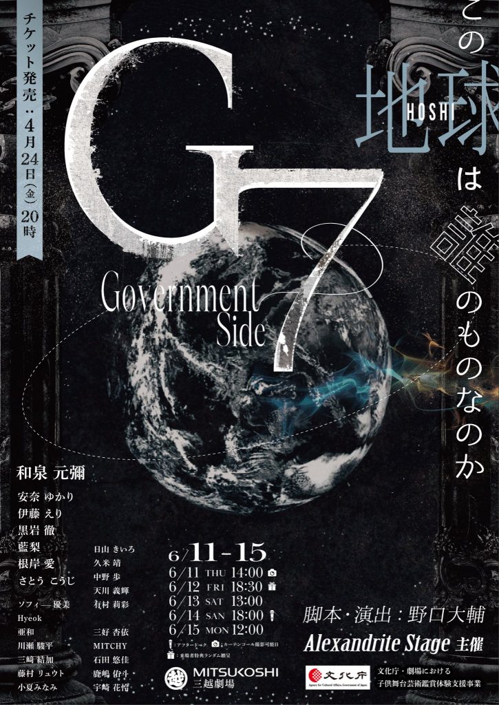 ニュース NEWS 2026.04.20 舞台 藤村リュウト舞台『G7』《Government Side》出演決定! 舞台『G7』《Government Side》出演させて頂きます! 2026年6月11日(木)〜15日(月)三越劇場 https://alexandrite-stage.themedia.jp INDEX 藤田 玲村上 幸平鎌苅 健太佐々木 崇髙木 俊曽世 海司石田 隼畠山 遼影山 達也崎元 リスト牛嶋 裕太大澤 信児山田 隼人藤村 リュウト三原 大和辻 悠正窪田 宗一郎田久保 宗稔立道 梨緒奈髙橋 果鈴西葉 瑞希山﨑 紫生宮原 理子友部 柚里森下 結音遊佐 菜摘白河 ななみ蒼生 みなみ松林楓なしお 成佐々木 麻美DUSTZ水樹 たまいしいのりえ片山 佳音三浦 茜音星野 沙羽井坂 はるね田中 晴